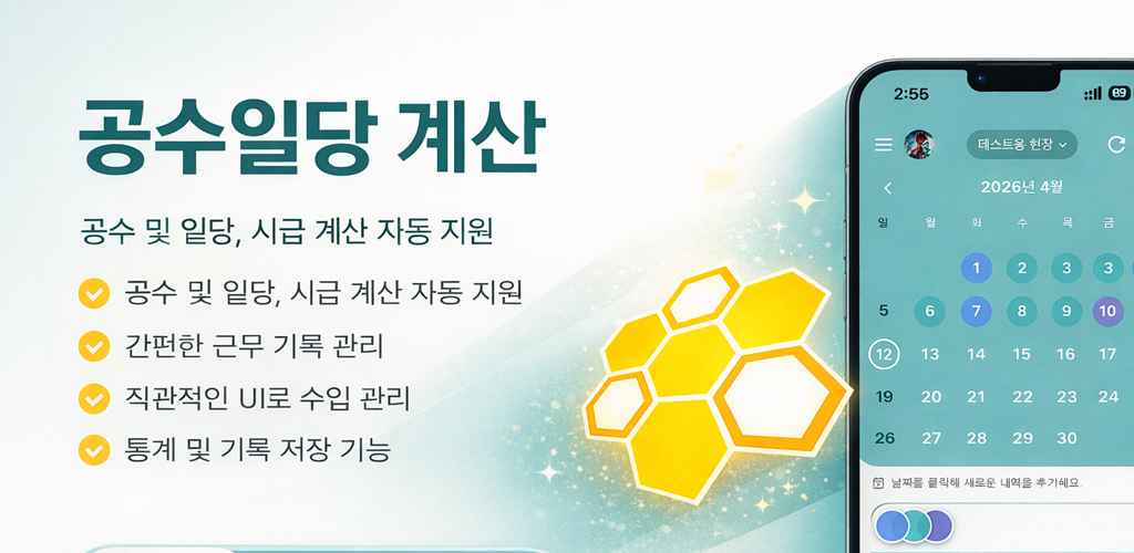 공수 일당 계산기 앱 WorkdayCalc의 비공개 테스트가 시작되어 안내드립니다. 본 테스트는 앱의 안정성과 사용성을 개선하기 위한 과정으로, 여러분의 소중한 의견이 큰 도움이 됩니다.